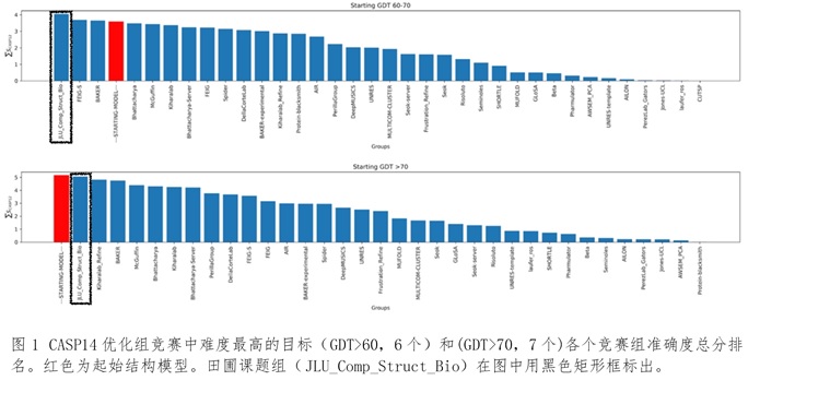针对蛋白质分子结构优化任务的核心是自由能最小化的本质,田圃团队首次引入计算图和自动微分,发展了局部分布理论的局部最大似然近似实现,并通过坐标变换实现了严格的键长键角刚性约束,得到了端到端动态模拟和自由能计算的人工智能方法(RSC Adv.2021,11:12929)。在CASP14 (//www.predictioncenter.org/casp14/index.cgi)全球蛋白质结构优化竞赛中,如图1所示,在难度最高(GDT打分大于60)的两组目标中,在获得最高准确度积分的同时展示出比主流方法高出三个数量级以上的效率。打破了主流分子模拟框架在准确度和效率之间选择的困境。