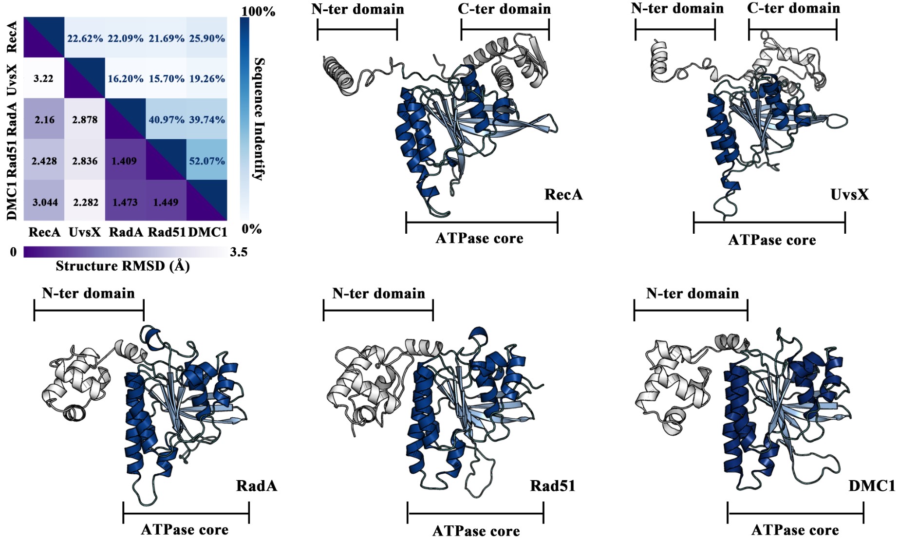 a. RecA, b.UvsX, c.RadA, d. Rad51, e. DMC1。