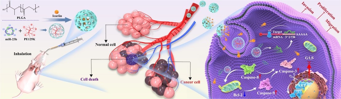 同时,miR-23b除具有抗炎功能外,其能够抑制细胞增殖,在肿瘤基因治疗研究中具有广阔的前景。研究团队针对肺癌传统治疗手段靶向性差及副作用大等缺陷,构建了以PLGA为基质的多孔微球体系,该体系实现了淫羊藿苷与miR-23b的担载,基于吸入式策略实现了药物与治疗基因在肺部的靶向沉积和持续释放,有效诱导肺癌细胞凋亡并抑制肿瘤转移,为肺癌的药物与基因联合治疗提供了一条局部给药新策略。相关研究“Porous PLGA microspheres for the inhalation delivery of icariin and miR-23b in the treatment of metastatic lung cancer”发表于国际学术期刊Asian Journal of Pharmaceutical Sciences(1区,影响因子10.7)。论文第一完成单位为亚洲情色