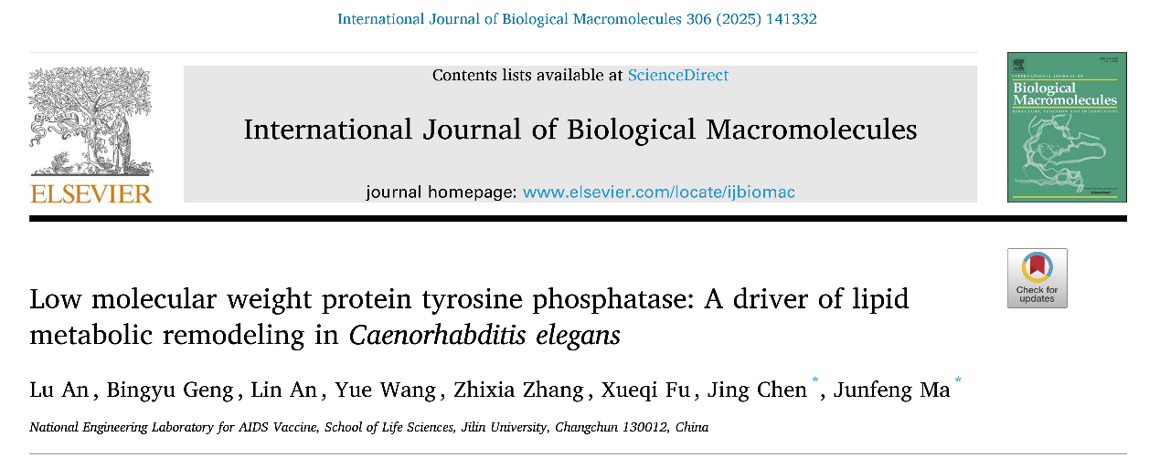 该成果以《Low molecular weight protein tyrosine phosphatase: A driver of lipid metabolic remodeling in Caenorhabditis elegans》为题,发表于国际学术期刊International Journal of Biological Macromolecules。此项研究工作得到了国家自然科学基金、国家重点研发计划以及吉林省科技发展项目的支持。论文的完成单位为亚洲情色