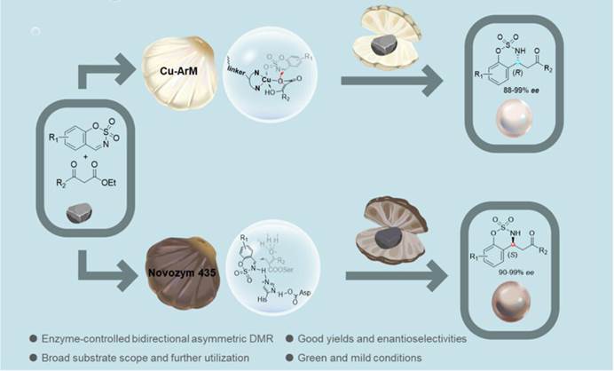 该研究报道了一种酶控双向对映选择性催化策略,用于不对称脱羧曼尼希反应(DMR)合成手性β-磺酰胺酮。研究通过构建铜人工金属酶(Cu-ArM)和利用商业脂肪酶Novozym 435,分别实现对R和S构型产物的高选择性合成。Cu-ArM由生物素化铜复合物与链霉亲和素(WT-Sav)组装而成,催化环状磺酰胺与β-酮酯反应生成R构型产物;而Novozym 435通过其催化三元活性中心调控反应路径,高效获得S构型产物。分子动力学模拟揭示了酶-底物相互作用机制,阐明环状亚胺因稳定氢键网络和紧凑构象而优于非环状底物的原因。该方法在温和水相条件下实现低催化剂负载(Cu-ArM仅0.5 mol%),并成功应用于克级合成及药物分子衍生物制备(如降压抗炎活性分子chroman-4-amine)。该工作为绿色合成手性含氮药物分子提供了新范例,拓展了生物催化在不对称合成中的应用潜力。论文第一完成单位为亚洲情色