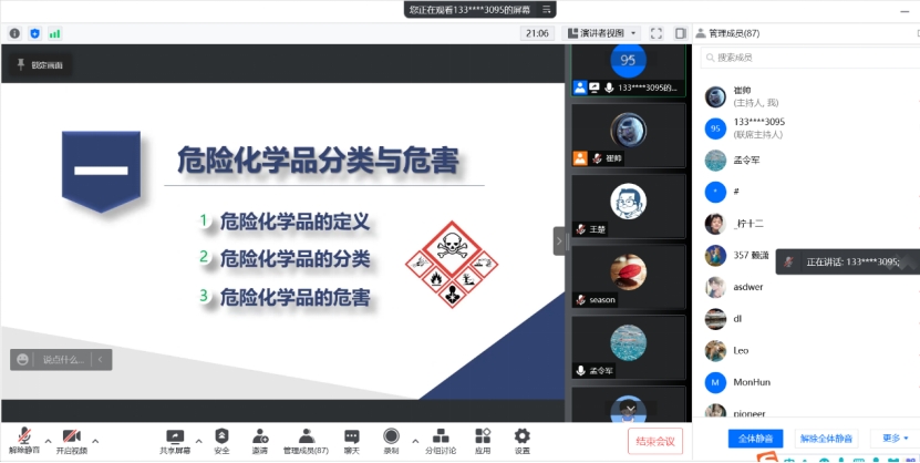 魏士刚从不同的分类方法出发全面细致的讲解了危险化学品的分类,纠正了错误的危化品分类认识,同时完善了师生的危化品分类知识,对于学院化学品全生命周期管理起到了重要的促进作用。他指出在使用化学品时可以根据官能团进行鉴别,对于会导致中毒、灼伤腐蚀以及危害环境的化学品使用时要格外注意。
