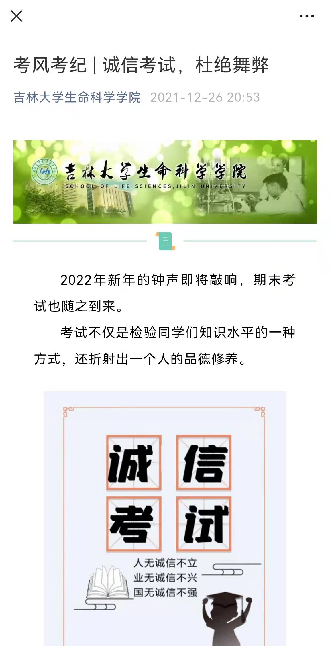 2021年12月26日,院学工办在学院公众号上发布了《考风考纪|诚信考试,杜绝舞弊》的推送,倡导优良学风与诚实诚信,并分年级召开了诚信考试教育动员会,要求全体学生严格遵守考试纪律,做到诚信应试,同时组织全体学生签订了《亚洲情色