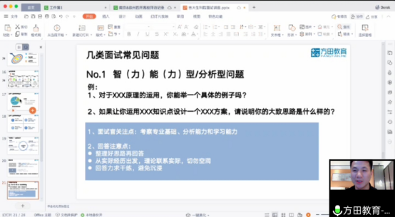 联合方田教育举办“一路同行就业季系列活动(五)——方田教育人力总监为你面试添砖加瓦”活动,由方田教育人力总监在腾讯会议在线为大家进行就业面试技巧培训,学院党委副书记林相友、崔帅及本院毕业年级学生及有相关需求的同学参会。