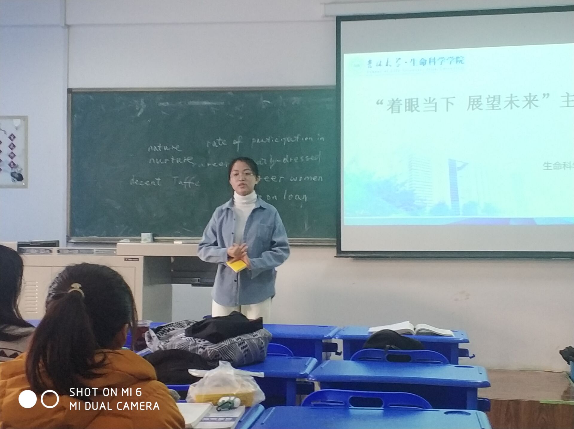 班会进程第三项,由在学科学习具有优异成绩的学姐就大一学习内容问题发表讲话,为同学们答疑解惑。学姐提到:课本与课件都十分重要,要课本与课件同步进行,充分吸收课程内容。