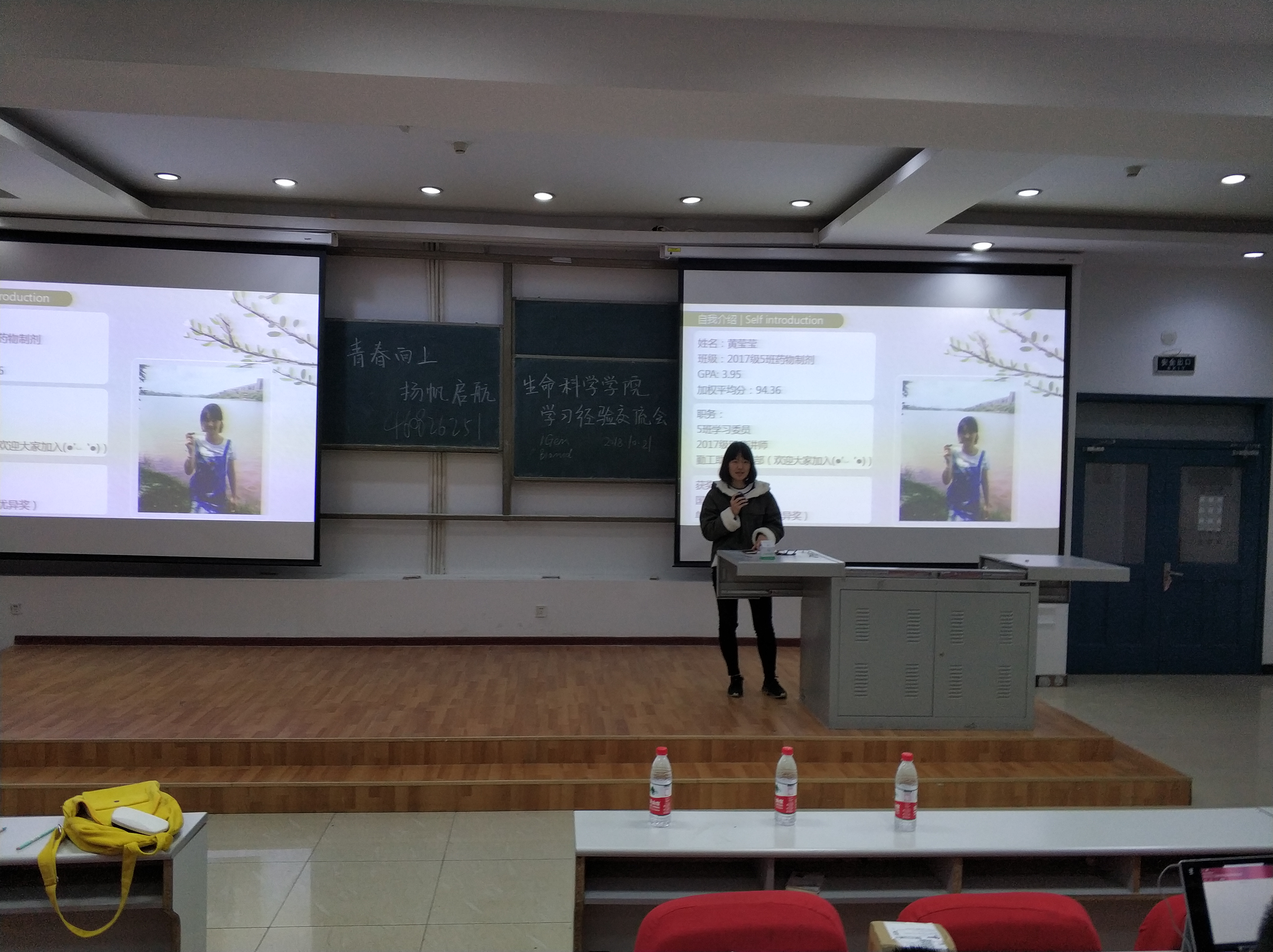 接下来由16级生物制药3班赵小豫学姐发言。赵学姐从自己的亲身经历出发,给大家讲解大学常碰到的雷区,用幽默的语言告诫大家要养成良好的学习习惯,注重平时的积累,保持紧张感。同时学姐留下了自己的联系方式表示愿意将自己的学习资料分享给大家,在学习上为大家提供帮助。
