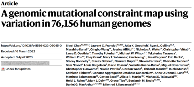 2014届唐敖庆班学生陈思唯(第一作者兼通讯作者)与Konrad J. Karczewski(共同通讯作者)联合Benjamin M. Neale和Daniel G. MacArthur团队共同在Nature上发表了题为A genomic mutational constraint map using variation in 76,156 human genomes的研究论文。
