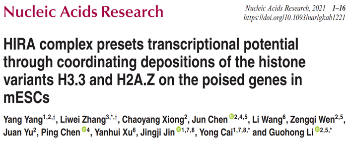 吉林大学生命科学学院蔡勇教授团队与中国科学院生物物理研究所李国红研究员团队合作,利用基因编辑技术结合CUT&Tag-ChIP-Seq等基因组学分析方法,阐释了小鼠胚胎干细胞(mESC)中组蛋白变体H3.3和H2A.Z之间通过协同调节增强子和启动子调控区域的染色质动力学来启始基因转录的作用机制。相关研究结果以“HIRA complex presets transcriptional potential through coordinating depositions of the histone variants H3.3 and H2A.Z on the poised genes in mESCs”为题,2021年12月11日在线发表于Nucleic Acids Research。
