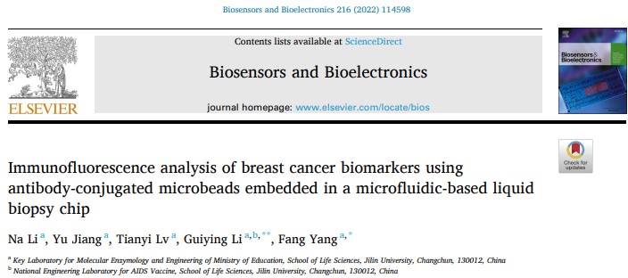 分子酶学工程教育部重点实验室李桂英教授、杨方副教授团队在微流控液体活检领域取得重要进展,相关研究内容已于近日以题为 Immunofluorescence analysis of breast cancer biomarkers using antibody-conjugated microbeads embedded in a microfluidic-based liquid biopsy chip 在线发表于Biosensors & Bioelectronics, 2022, 216: 114598。