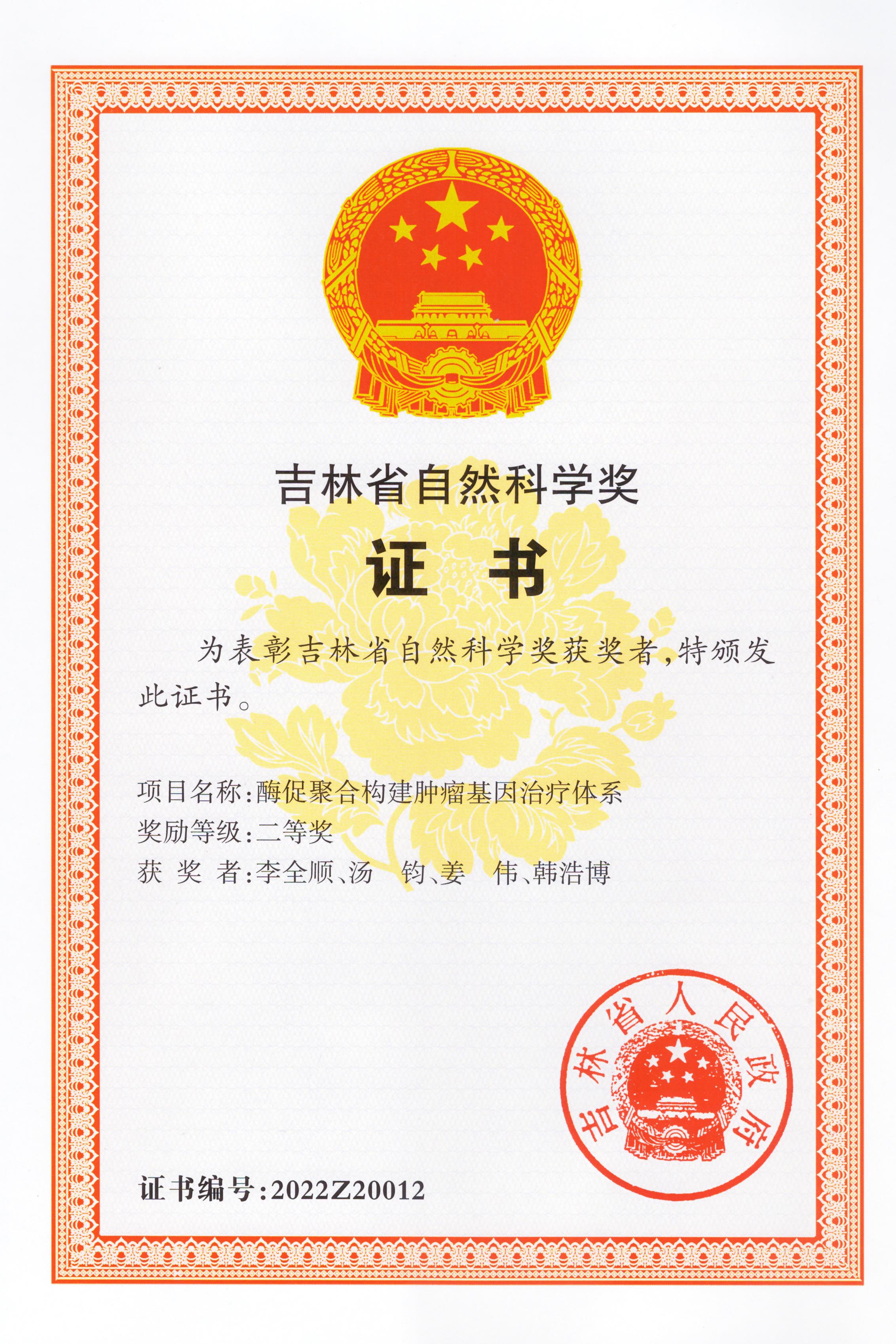 李全顺教授团队完成的“酶促聚合构建肿瘤基因治疗体系”项目荣获吉林省自然科学奖二等奖(获奖人:李全顺、汤钧、姜伟、韩浩博)。