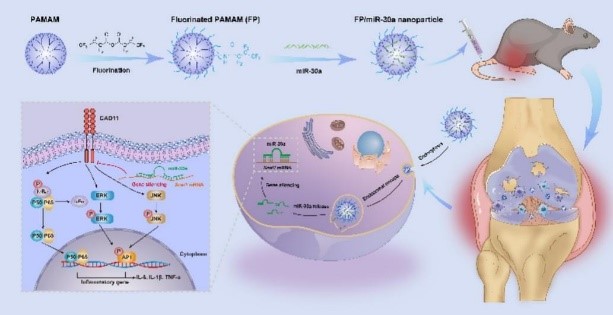 分子酶学工程教育部重点实验室李全顺/韩浩博团队,在基于miR-23b递送抗类风湿性关节炎研究的基础上(Nat. Commun. 2023, 14: 944),挖掘了一类与炎症发生发展密切相关的miRNA—miR-30a,其通过靶向Snai1基因进而调节Cad11表达,抑制NF-κB和MAPK信号通路,实现类风湿性关节炎的精准治疗;以氟化聚酰胺-胺树枝状聚合物为载体,实现了miR-30a的体内稳定递送,动物水平取得了良好的抗炎效果,为类风湿性关节炎及其他自身免疫性疾病的基因治疗研究提供了新的思路。相关研究“Fluorinated dendrimer-mediated miR-30a delivery regulates the inflammation of macrophages and mitigates the symptoms of rheumatoid arthritis”发表于国际学术期刊Journal of Controlled Release(1区,影响因子10.5)。论文第一完成单位为亚洲情色