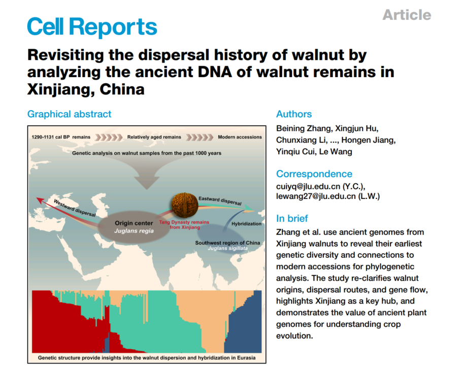 吉林大学生命科学学院崔银秋教授与植物科学学院王乐副教授团队利用古DNA技术成功获取了世界首例古代核桃全基因组数据,并综合运用古基因组学与群体遗传学分析手段系统揭示了核桃(Juglans regia)在丝绸之路上的传播路径及遗传演化特征。该研究不仅填补了核桃古基因组数据的空白,更为揭示丝绸之路上关键经济作物的传播历史与驯化轨迹提供了直接的分子证据。该研究成果以“Revisiting the dispersal history of walnut by analyzing the ancient DNA of walnut remains in Xinjiang,China”为题,在国际权威学术期刊《Cell Reports》上发表。吉林大学生命科学学院博士生张倍宁和新疆大学的胡兴军教授为论文共同第一作者,王乐、崔银秋为共同通讯作者。