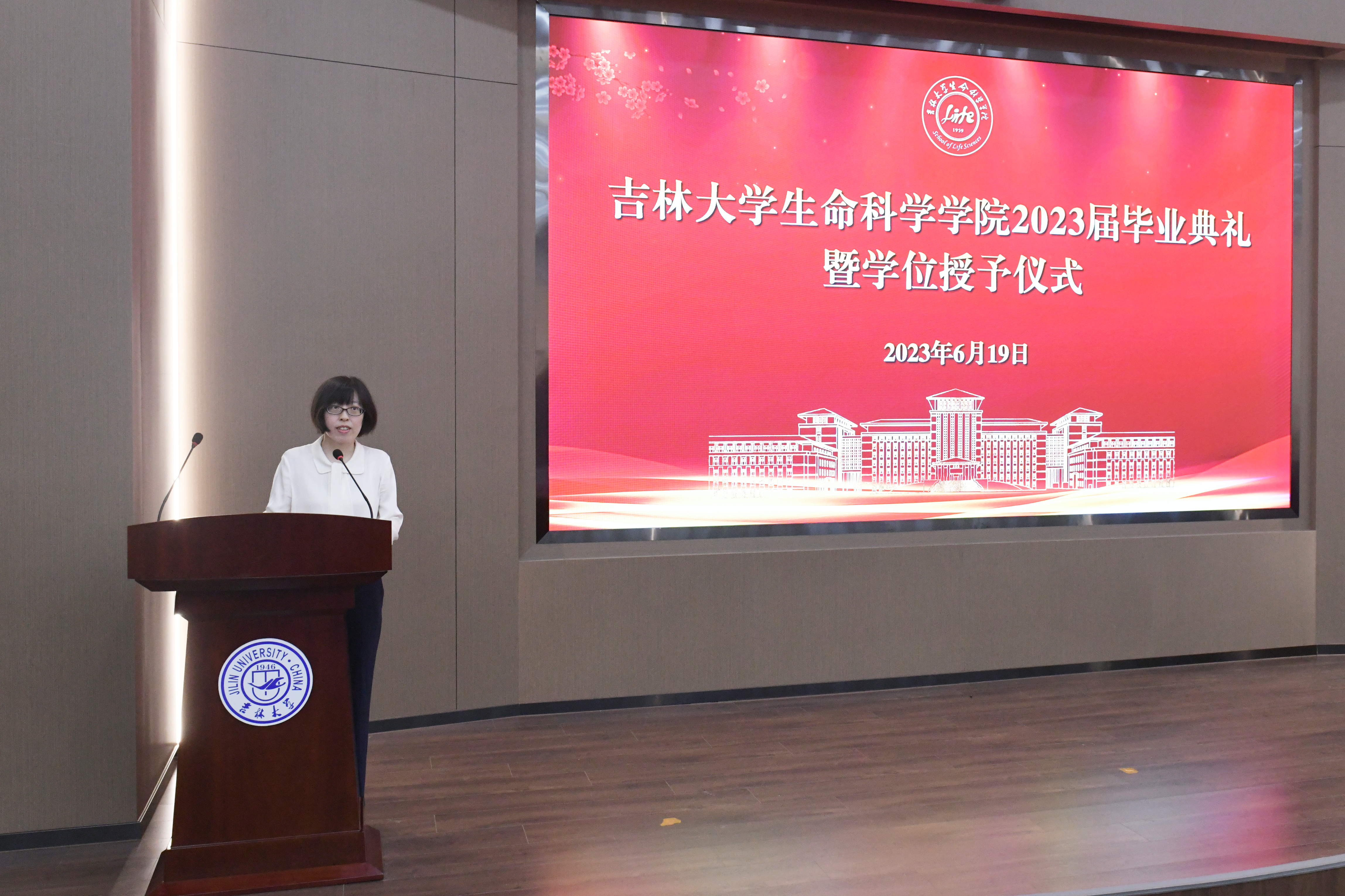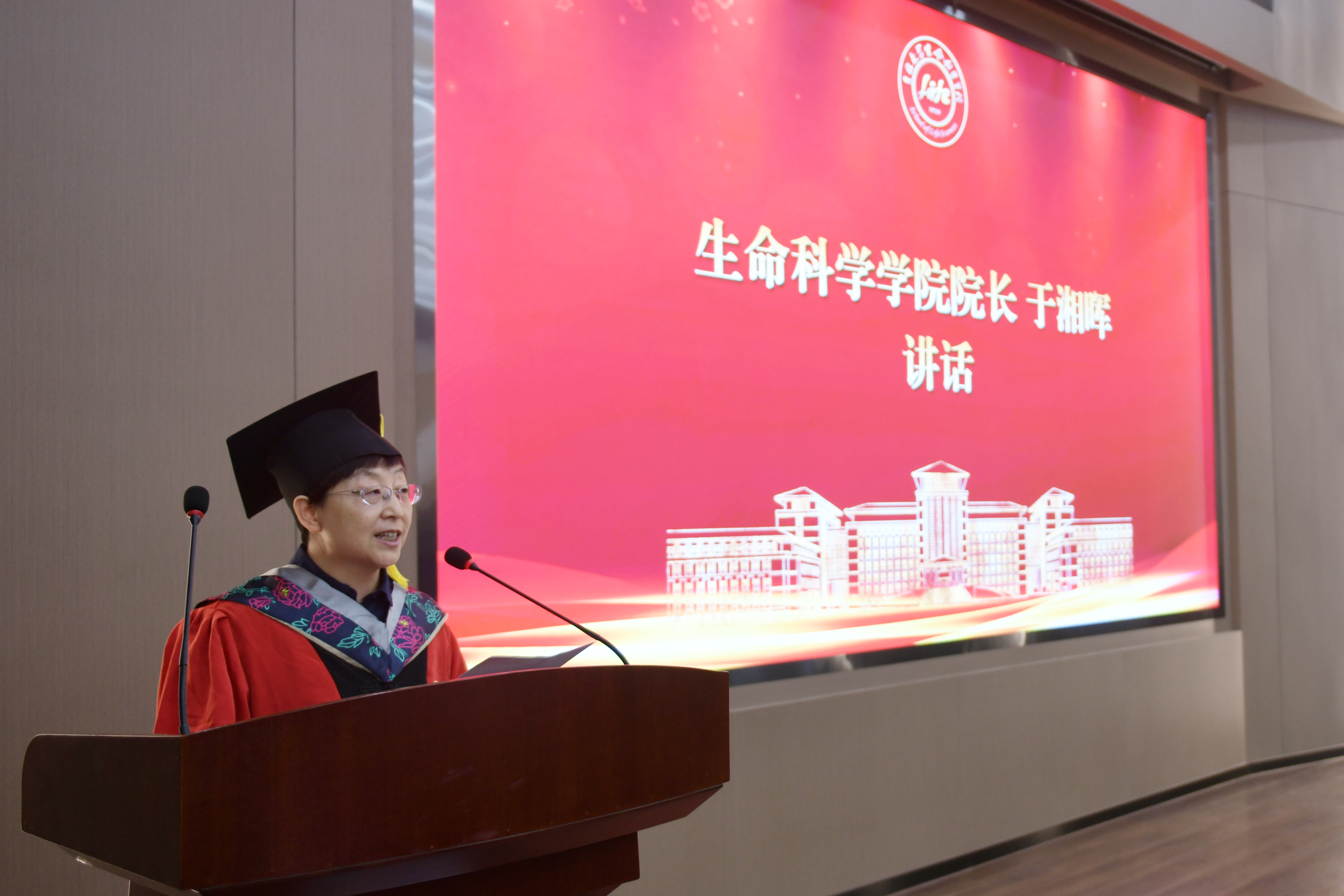 最后,于湘晖院长向圆满完成学业、即将踏入人生新征程的全体毕业生表示祝贺。在临别之际,她寄语同学们:一是要拥有家国情怀与科学人生。希望同学们能将个人的成长融入于国家学科发展对于人才的迫切需求之中,融入于国家富强、民族复兴的发展进程之中,面向国家重大需求、面向人民生命健康,以实际行动与科学素养为建设教育强国、人才强国、健康中国、创新中国贡献青年力量。二是要赓续吉大精神与生科血脉。要有不囿于一隅的胆气,要有不惑于未知的底气,要有不困于失败的锐气,真正做坚定不移地勇攀高峰、自强不息地跋涉前行的吉大人;做既能坐的住冷板凳,又能保持着赤子心,既能吃得住科研的苦,又能欣赏科研的美,既有传承,又要开拓的生科人。三是要持守发现美的眼睛与探索美的心灵。在解码生命奥秘的过程中领略更多生命和自然之美,在众声喧哗中激浊扬清,在时移世变中允中守直,既能守护灵魂的纯净,守卫人性的善良,以根植于内心的道德做一个发现光芒、散发光芒的人;也能守住独立的人格,守持求索的精神,以稳定于心的内核做一个自知、自信、自美、自励的人。