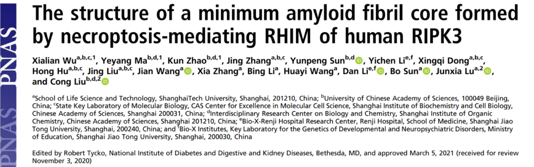 综合运用冷冻电镜和固态核磁技术阐释了RIPK3动态组装形成功能性淀粉样纤维的结构基础,并进一步探讨了RIPK3形成的功能性纤维在necroptosis信号传导中发挥作用的潜在机制