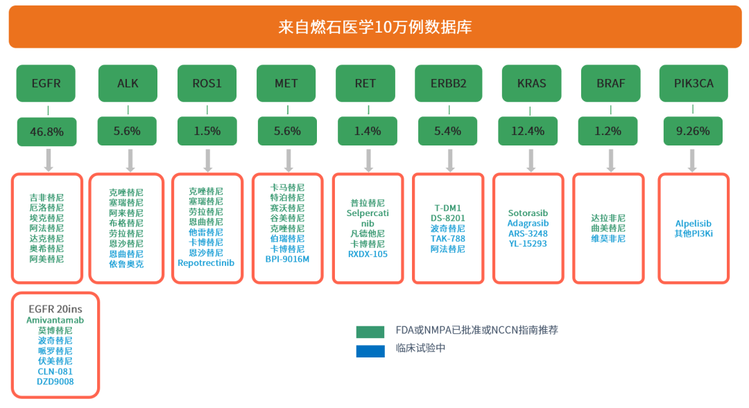 中国肺癌患者主要驱动变异发生率(基于燃石内部数据)及对应靶向药物