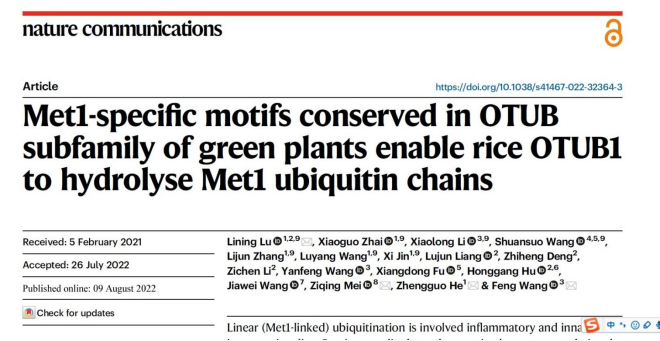 校友王丰(北京理工大学生命学院)、梅子青(北京科技大学化学与生物工程学院)与广西大学何正国团队合作联合在国际著名学术期刊《自然-通讯》(Nature Communications)发表题为《绿色植物OTUB亚家族中保守的Met1特异性基序使水稻OTUB1能够水解Met1泛素链》(Met1-specific Motifs conserved in OTUB subfamily of green plants enable rice OTUB1 to Hydrolyse Met1 Ubiquitin Chains)的研究论文。该工作在国际上首次揭示了水稻去泛素化酶OTUB1水解Met1泛素链的分子机制,发现了跨物种范围OTUB亚家族成员水解Met1泛素链的分子开关。