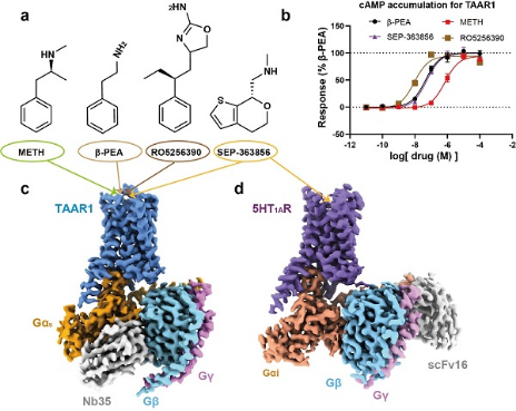 图二.四种TAAR1激动剂激活TAAR1的功能评估及TAAR1-Gs,5HT1A-Gi复合物的整体结构。(a)四种TAAR1激动剂的结构式(b)四种配体激活TAAR1的功能评估(c-d)TAAR1-Gs,5HT1A-Gi复合物的整体结构密度图。